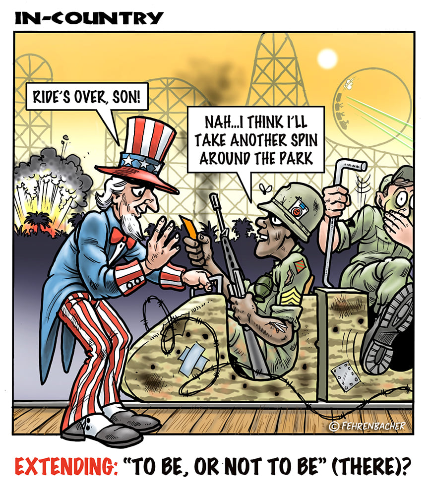 Phil enlisted in the Army in 1965 where he served for years in Vietnam. He became a graphic designer and has worked for the state of Oregon for 26 years. He retired in 2003 and started the Cartoon "In-Country". The cartoons reflect his experiences during his tour of duty in South Vietnam.